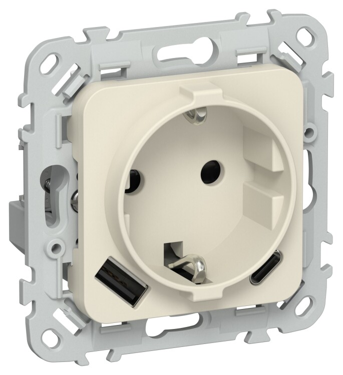 FLITE Розетка 1-местная с заземлением с защитными шторками 16А с USB A+C 20Вт РСЮшс11-0-ФлСл сливочн