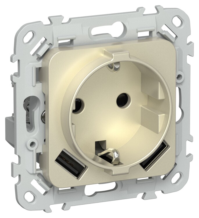 FLITE Розетка 1-местная с заземлением с защитными шторками 16А с USB A+A 3,1А РСЮша11-0-ФлШ шампань