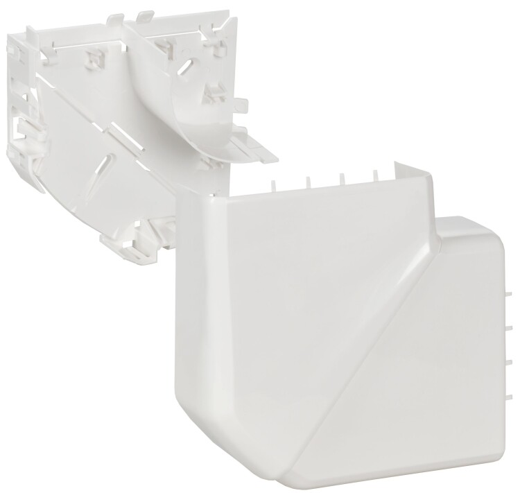 Плоский угол предназначен для соединения двух кабель-каналов одинакового сечения под плоским углом 85–95°. Позволяет избежать разрезания кабель-канала под острым углом, обеспечивает степень защиты IP40, улучшает внешний вид и скрывает место разреза. Угол защёлкивается на корпус кабель-канала. Допускается установка на кабель-каналы с разделительными/несущими перегородками или без них. Цвет: белый