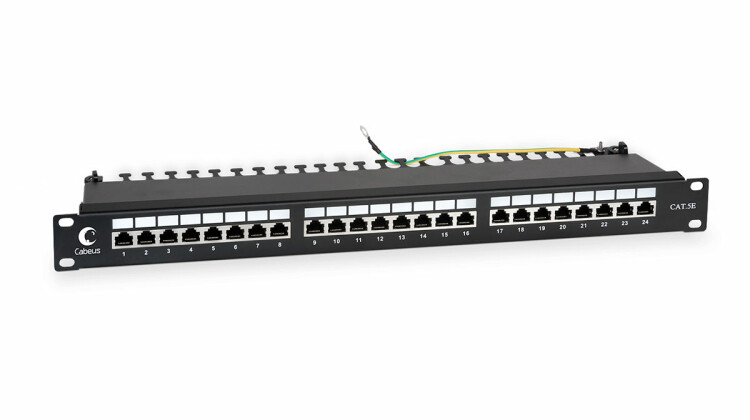 Коммутационные панели (патч-панели) предназначены для терминирования на них кабелей различных подсистем СКС и для коммутации отдельных элементов сети друг с другом при помощи коммутационных шнуров. Экранированная патч-панель Cabeus выполнена в 19” формате и предназначена для установки в телекоммуникационные шкафы и стойки. Соответствует характеристикам категории 5е. С лицевой стороны все порты пронумерованы и имеют дополнительные поля для нанесения маркировки. Корпус полностью металлический с разборной крышкой быстрой фиксации. Имеется проводник заземления. С тыльной стороны патч-панели размещены контакты типа Dual IDC с цветной маркировкой по двум стандартам: T568 А и B. Ножи контактов располагаются под 45°, что лучше сказывается на передаточных характеристиках разъема. Для заделки проводников подходят ножи тип 110 и Krone. Патч-панель имеет встроенный задний организатор для фиксации кабелей и дополнительный фиксатор экрана кабеля.