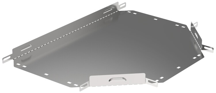 Разветвитель Т-образный горизонтальный предназначен для организации Т-образного ответвления кабельной трассы в горизонтальной плоскости. Аксессуар поставляется в плоском виде, имеет направляющую перфорацию для сгиба и сборки изделия перед установкой. Стыковка аксессуара с лотком осуществляется за счёт телескопического соединителя. Подходит для всех типов листовых лотков серии ESCA. Крышка на аксессуар заказывается отдельно. Аксессуар изготовлен из стали оцинкованной методом Сендзимира (защитный слой цинка не менее 5-10 мкм).