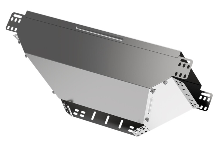 Ответвитель Т-образный вертикальный вниз боковой предназначен для организации Т-образного отвода кабельной трассы вниз с изменением направления лотка на 90 градусов. Аксессуар поставляется в комплекте с крышкой. Аксессуар изготовлен из стали горячего цинкования методом Сендзимира (защитный слой цинка не менее 10 мкм).