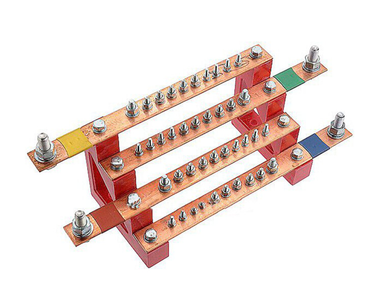 Блок медных шин 3х(25 мм)x11 (М5 - 4 шт.; М6 - 5 шт.; М8 - 1 шт.; М12 - 1 шт.) присоединений, ширина - 395 мм, 340А (CBG-БФШ4-3.25-11). Предназначен для установки в низковольтных комплектных устройствах (НКУ). Служит для распределения переменного трёхфазного тока. Материал шины: медь.