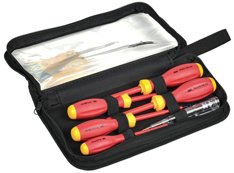 Набор диэлектрических отверток серии К3 рассчитан на использование под напряжением до 1000В. Набор включает в себя: крестообразную отвертку PH2х100; шлицевые - SL2,5х75, SL4,0х100, SL5,5х125; пассатижи К3 160мм и отвертку-пробник ОП-1. Материал рукояток – полипропилен и поливинилхлорид PP+PVC.