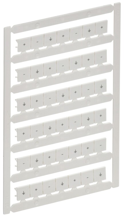 Маркеры ARMAFIX используются для маркировки рядов клеммных колодок ARMAFIX в системах распределения. Устанавливаются в соответствующие пазы клеммы. Выполнены в виде пластин. Каждая площадка может отсоединяться друг от друга. Совместимы с клеммами ARMAFIX CP 1,5мм2. На маркерах нанесены обозначения "+, - знак заземления". Печать выполнена способом, который обеспечивает долговечную и нестираемую маркировку. Изготавливаются из поликарбоната. В карте 42 маркера.
