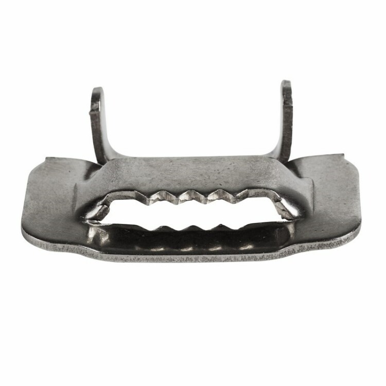 Усиленная скрепа (бугель) для монтажной ленты. Изготовлена из нержавеющей стали AISI 304. Предназначена для фиксации монтажной ленты на анкерных и угловых опорах.