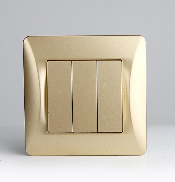 Выключатель трехклавишный, 10А, 220-250V (золотой) используется для управления несколькими контурами освещения из одной точки. Применяется для скрытого монтажа в стены в подрозетник или накладную монтажную коробку глубиной не менее 40мм. В комплект входит суппорт для монтажа на захватах (распорных лапках) или винтах, выполненный из прочного сплава и лицевая накладка из качественного ABS-пластика, устойчивого к царапинам и УФ-излучению.