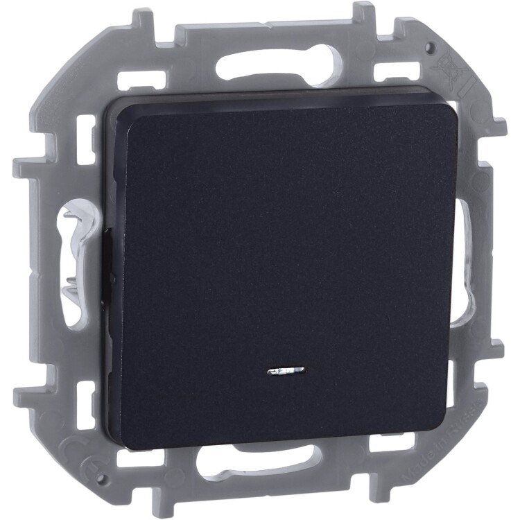 Переключатель одноклавишный с подсветкой/индикацией скрытого монтажа Inspiria, цвет "Антрацит", номинальный ток 10АХ, напряжение ~250В, безвинтовые зажимы. Устанавливается в жилых и общественных помещениях для управления приборами освещения, вентиляции и т.д. Предназначен для управления одной нагрузкой с одного, двух или более мест (совместно с перекрёстными переключателями).