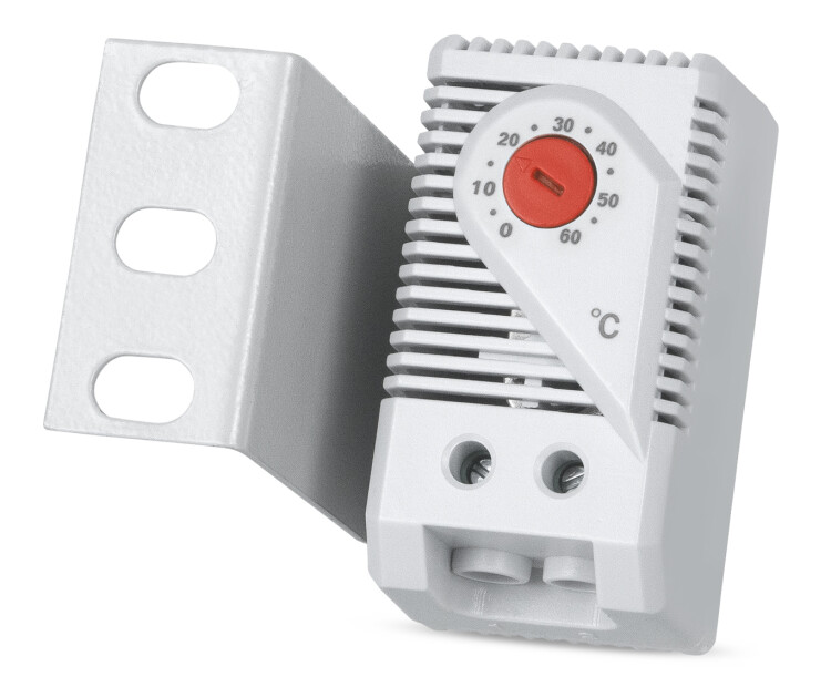 KTO011: нормально-замкнутый контакт (NC) для регулирования нагревателей. Термостат предназначен для регулирования температуры. Температура задается пользователем с помощью поворотного регулятора на корпусе термостата. Термостат подключается в разрыв сети питания нагревательного элемента и при достижении заданной температуры размыкает цепь питания. После снижения температуры ниже установленного уровня, цепь питания снова замыкается. Термостат поставляется вместе с креплением для установки на направляющие 19”.