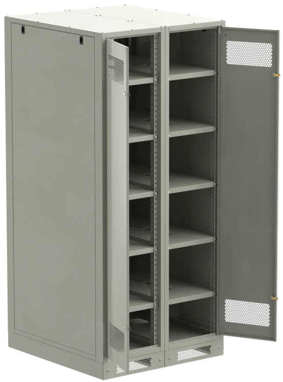 Шкаф аккумуляторный серии LINEA B предназначен для размещения и защиты от несанкционированного доступа аккумуляторных батарей (АБ). Шкафы LINEA B повышенной прочности со сварным каркасом и усиленными полками позволяют размещать АБ до 500 кг. на полке. Вместе со шкафом поставляются полки. Количество полок в комплекте зависит от высоты шкафа. Каркас позволяет размещать полки с шагом 30мм. В полках предусмотрены вырезы для удобства соединения АБ. В нижней части корпуса предусмотрена плата для установки предохранителя-выключателя-разъединителя ПВР. Шкаф аккумуляторный серии LINEA B двухсекционный поставляется на цоколе высотой 100мм. и состоит их двух секций. В месте эксплуатации требуется соединение секций метизами из комплекта поставки. Все металлические части шкафа LINEA B заземлены. В комплект включены РЫМ-болты для удобства перемещения шкафа. Вентиляционные отверстия в дверях и задней панели обеспечивают циркуляцию воздуха.