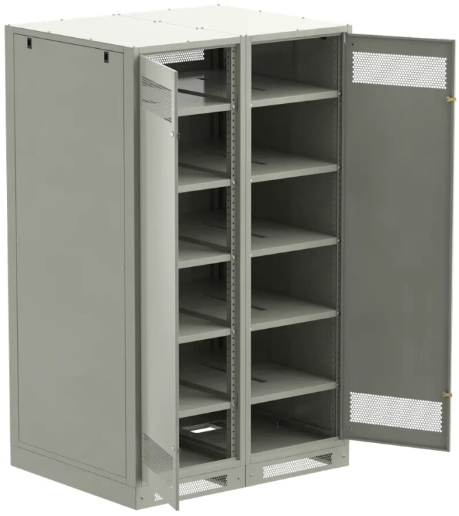 Шкаф аккумуляторный серии LINEA B предназначен для размещения и защиты от несанкционированного доступа аккумуляторных батарей (АБ). Шкафы LINEA B повышенной прочности со сварным каркасом и усиленными полками позволяют размещать АБ до 500 кг. на полке. Вместе со шкафом поставляются полки. Количество полок в комплекте зависит от высоты шкафа. Каркас позволяет размещать полки с шагом 30мм. В полках предусмотрены вырезы для удобства соединения АБ. В нижней части корпуса предусмотрена плата для установки предохранителя-выключателя-разъединителя ПВР. Шкаф аккумуляторный серии LINEA B двухсекционный поставляется на цоколе высотой 100мм. и состоит их двух секций. В месте эксплуатации требуется соединение секций метизами из комплекта поставки. Все металлические части шкафа LINEA B заземлены. В комплект включены РЫМ-болты для удобства перемещения шкафа. Вентиляционные отверстия в дверях и задней панели обеспечивают циркуляцию воздуха.