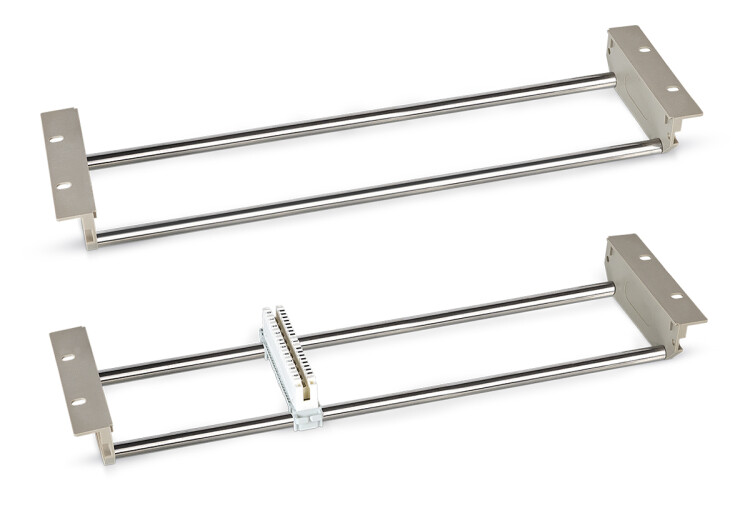 Рама-штанга, с круглыми направляющими, предназначена для установки на неё 10-ти парных плинтов типа KRONE. Используется для установки в шкафы и стойки стандарта 19”. Высота конструктива составляет 3U. Количество плинтов, которые можно установить на такой конструктив, составляет 18 шт. Из-за конструктивных особенностей подключение заземления невозможно.