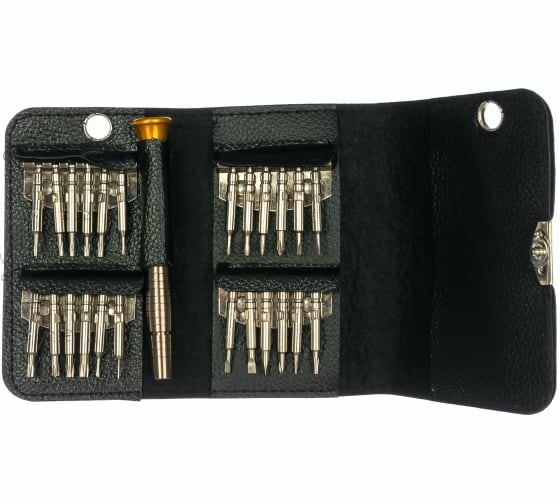 Набор отверток REXANT 25 в 1 оптимален для выполнения прецизионных работ в электронике и электромеханике, ремонта большинства видов и моделей популярной портативной техники: смартфонов, часов, планшетных ПК, игровых приставок, фотокамер, электронных сигарет. Характеристики: TORX (шестигранная звезда): T2, T3, T4, T5, T6, T8, T10, T15 PHILLIPS (крестовая): PH1.0, PH1.2, PH1.5, PH2.0, PH3.0 SLOT (шлицевая): SL1.0, SL1.5, SL2.0, SL3.0 Pentalobe (шлиц): 0.8, 1.2 (для продукции Apple) Special (шлиц): PH2.5 (для продукции Apple) Tri-Wing (трехлистник): Y0.6 (для iPhone7, 7 plus, Apple Watch) Tri-Wing (трехлистник): 2.0 Треугольный шлиц: 2.3 ⊙ (аналог скрепки для слота SIM-карты) 0.8 Отвертка: да Посадка бит: 1/8 Материал насадок: хромованадиевая сталь Материал кейса: экокожа