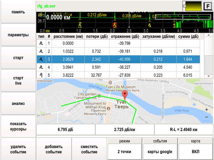 Данная опция – это встраиваемый модуль геолокации и мобильного интернета. Он позволяет легко привязывать события на рефлектограмме к координатам на карте. С помощью этого модуля прибор способен определять свое местоположение по сигналам со спутников GPS или GLONASS. Таким образом первое событие, начало рефлектограммы, может получать автоматически координату. Далее оставшиеся события рефлектограммы пользователь может вручную расставить на онлайн-карте (Google-maps). Благодаря мобильному интернету, прибор автоматически подгружает карту той местности, где сейчас находится прибор. Применение онлайн-карты дает выгодное преимущество по сравнению со статическими (проприетарными) картами, всегда имеется актуальная картографическая информация, что особенно важно в городской застройке, при прокладке местных лини ВОЛС. Для использования опции мобильного интернета нужно вставить активированную сим-карту в лоток-держатель на передней панели. Прибор может работать со всеми российскими операторами мобильной связи.