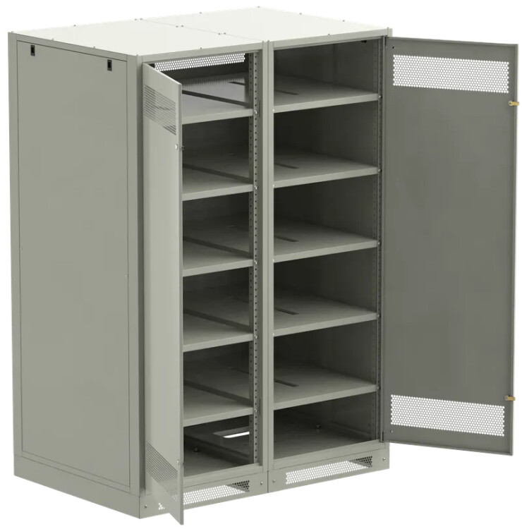 Шкаф аккумуляторный серии LINEA B предназначен для размещения и защиты от несанкционированного доступа аккумуляторных батарей (АБ). Шкафы LINEA B повышенной прочности со сварным каркасом и усиленными полками позволяют размещать АБ до 500 кг. на полке. Вместе со шкафом поставляются полки. Количество полок в комплекте зависит от высоты шкафа. Каркас позволяет размещать полки с шагом 30мм. В полках предусмотрены вырезы для удобства соединения АБ. В нижней части корпуса предусмотрена плата для установки предохранителя-выключателя-разъединителя ПВР. Шкаф аккумуляторный серии LINEA B двухсекционный поставляется на цоколе высотой 100мм. и состоит их двух секций. В месте эксплуатации требуется соединение секций метизами из комплекта поставки. Все металлические части шкафа LINEA B заземлены. В комплект включены РЫМ-болты для удобства перемещения шкафа. Вентиляционные отверстия в дверях и задней панели обеспечивают циркуляцию воздуха.
