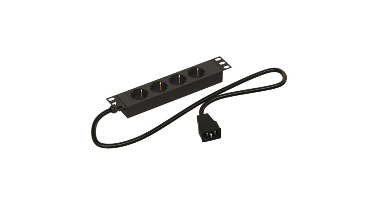 Hyperline SHE10-4SH-1.8IEC Блок розеток для 10" шкафов, горизонтальный, 4 розетки Schuko, кабель питания 1.8м (3х1.0мм2) с вилкой IEC320 C14 10A, 250В, 270х44.4х44.4мм (ДхШхВ), корпус алюминий, черный