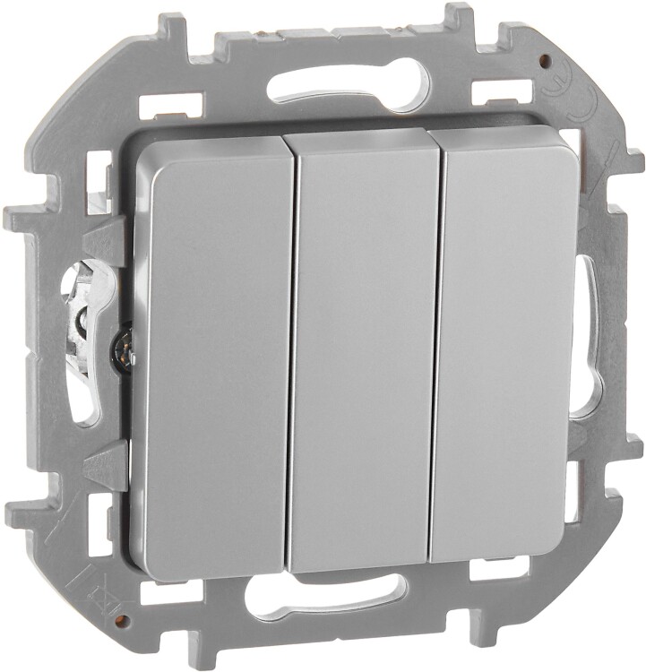 Выключатель трёхклавишный скрытого монтажа Inspiria, цвет "Алюминий", номинальный ток 10АХ, напряжение ~250В, винтовые зажимы. Устанавливается в жилых и общественных помещениях для управления приборами освещения, вентиляции и т.д. Предназначен для независимой коммутации трёх нагрузок с одного места. Подходит для управления многорожковыми люстрами и осветительными приборами с большим количеством ламп.