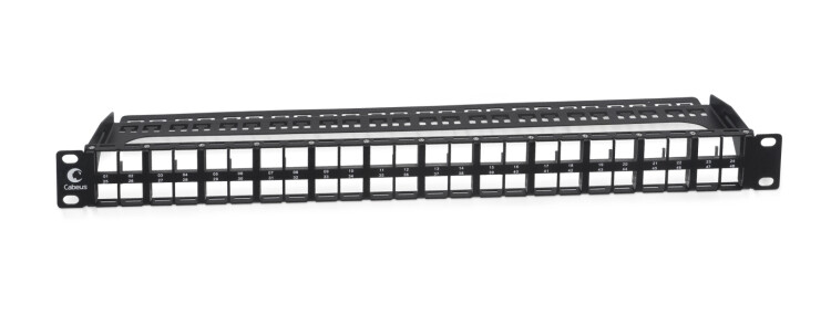 Коммутационные панели (патч-панели) предназначены для терминирования на них кабелей различных подсистем СКС и для коммутации отдельных элементов сети друг с другом при помощи коммутационных шнуров. Модульная патч-панель Cabeus выполнена в 19” формате высотой 1U и предназначена для установки в телекоммуникационные шкафы и стойки. Используется для установки 48 неэкранированных модулей типа Keystone. Модульные патч-панели обеспечивают максимальную гибкость при эксплуатации сетей, позволяя легко и быстро переконфигурировать систему соединений под индивидуальные потребности.
