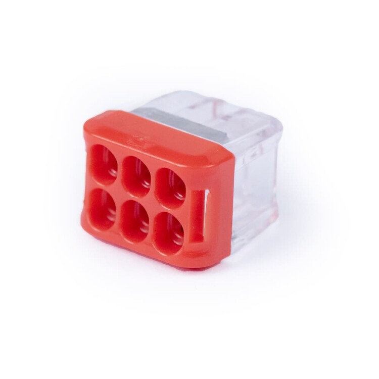 Соединительная изолированная клемма предназначена для соединения одножильных медных проводников. Фиксация проводников в клемме осуществляется при помощи плоско-пружинного зажима. Специальное технологическое отверстие на корпусе клеммы предназначено для проверки соединения тестером-пробником или щупом мультиметра. Клеммы обеспечивают простой и быстрый монтаж. Основные характеристики: Количество зажимов - 6, Наличие контактной пасты - нет, Проводник - одножильный, Материал проводника - медь, Сечение проводника - до 2,5 мм², Номинальный ток - 24 А, Максимальное напряжение - 450 В, Материал контактов - луженая медь, Материал корпуса - полиамид, Температура эксплуатации: -30°C...85°C.