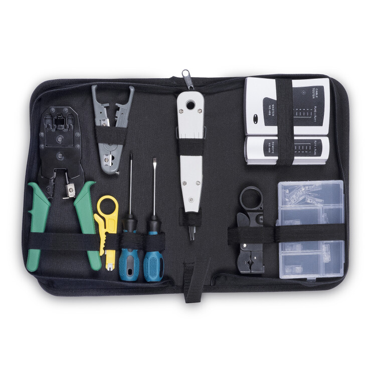 Универсальный набор инструмента предназначен для работы с кабелем витой пары и коаксиальных кабелей. Инструменты, входящие в набор, позволяют производить операции по обрезке и зачистке кабелей витой пары, разделке их на IDC-контактах патч-панелей и кейстоунов, заделке проводников на телефонных плинтах Krone, а также обжим коннекторов RJ-11/12 и RJ-45. Для удобства хранения и транспортировки инструменты поставляются вместе с сумкой-чехлом. В набор входят: -Инструмент для обжима коннекторов RJ-11 (4р4с), RJ-12 (6p6c) и RJ-45 (8p8c), торцевой; -Инструмент для зачистки и обрезки кабеля HT-S501A; -Инструмент для зачистки коаксиального кабеля HT-312B; -Инструмент для заделки проводников в плинты Krone; -Инструмент для зачистки и разделки витой пары НТ-318 -Отвертка крестовая; -Отвертка шлицевая; -Коннектор RJ-45 8P8C cat 5е - 10 штук; -Кабельный тестер с разъемами RJ45/RJ11