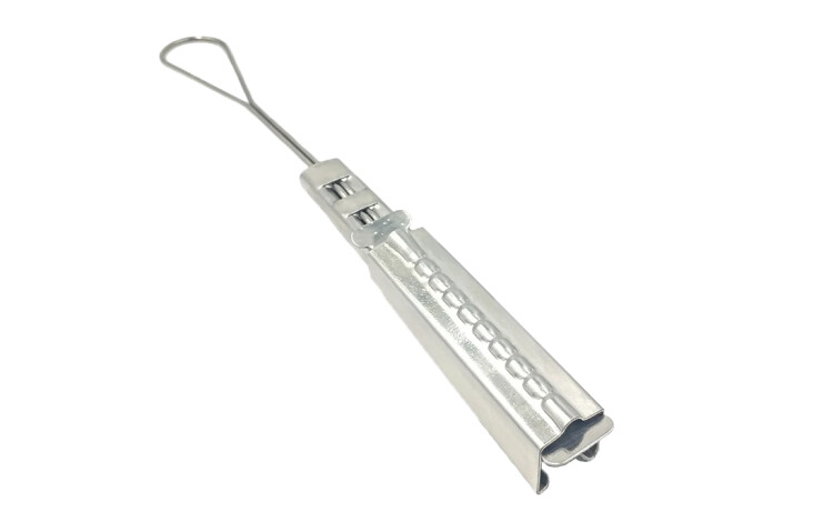 Используются для монтажа на столбах и опорах в городских и загородных сетях PON DROP кабелей круглого исполнения с диаметром до 6мм. Конструкция зажима позволяет подвешивать на кабельных трассах при любых углах поворота. Зажимы изготавливаются из нержавеющей стали. Конструкция зажима исполнена из продольного ребристого корпуса, перфорированной вставки для лучшего сцепления с наружной оболочкой плоских и овальных кабелей и клинообразным стержнем с прикрепленной петлей для монтажа к кронштейнам и узлам.