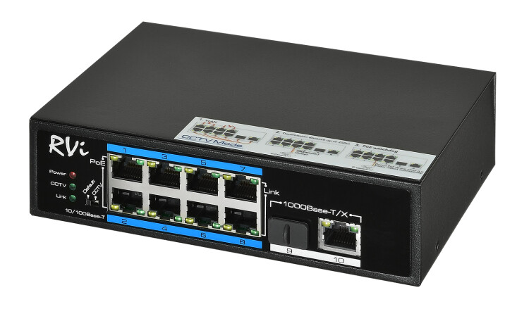Сетевой коммутатор RVi-2NSI08F-2H с поддержкой стандарта питания PoE обеспечивает возможность подключения устройств с повышенным энергопотреблением (до 30 Вт). Минимальное время восстановления работы после отключение питания (порядка 5 секунд). Дальность передачи сигнала может быть увеличена со 100 метров до 250 метров путем переключения портов коммутатора в режим CCTV. Для этого необходимо перевести переключатель «режим работы портов», расположенный на задней стенке коммутатора, из режима Default в режим CCTV. В комплекте с RVi-2NSI08F-2H поставляются адаптеры для установки коммутатора в шкаф на DIN рейку или на вертикальную поверхность.