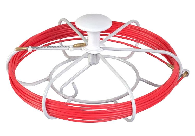 Предназначено для протяжки кабеля различного назначения в гофротрубах, металлоруковах, закрытых коробах и других видах кабельных каналов зданий. Представляет собой металлическую кассету, в которую помещен стеклопластиковый пруток с защитным покрытием из полиэтилена высокой плотности. Один конец прутка оконцован латунным наконечником с резьбой, на котором размещается коуш или может быть установлена сменная лидер-насадка (идет в комплекте). Второй конец имеет несъемный наконечник в виде коуша. Оконцовка стеклопрутков наконечниками дополнительно сопровождается их склейкой клеем ВК-9 производства ССД. За счет этого достигается наивысшая прочность фиксации наконечников. Кассета изготовлена из металла покрытого порошковой эмалью. Состоит из 6 изогнутых спиц, которые прочно приварены к кругу. На вершине одной из спиц находится втулка, в которую вставляется один из концов стеклопрутка. По центру кассеты проходит подвижная ось. На одном ее конце расположена пластиковая ручка, а на другом металлический «крюк», позволя