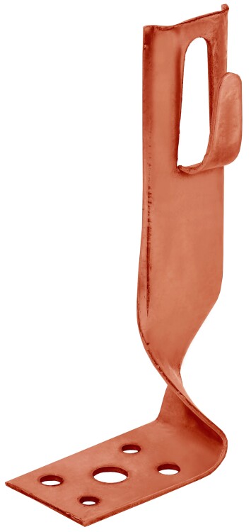 Держатель угловой скрученный с безболтовым зажимом предназначен для монтажа проводника на горизонтальные, вертикальные или наклонные поверхности. Скрученная конструкция держателя позволяет крепить проводник на узкие парапеты. Монтируется на поверхности при помощи саморезов. Зажим проводника происходит путём загибания «язычка» держателя. Материал корпуса - медь.