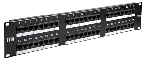 ITK 2U патч-панель кат.5Е UTP, 48 портов (Dual) Тип патч-панели UTP; Категория 5E; Кол-во портов 48; Высота 2U; Тип монтажа на 19” профиль; Диаметр кабеля/патч-корда 22-26AWG; Тип модулей IDC Dual; Маркировка цифровая и цветовая; Материал контактов бронза с позолотой; Цвет панели с портами черный; Сила тока макс 1,5 А; Напряжение 150 В; Контактное сопротивление 20 мОм; Температура эксплуатации: 0°C – +60°C; Сопротивление изоляции 500 МОм; Кабеля в упаковке: 500 м; Особенности конструкции: исполнение с кабельным органайзером и без.; Материал корпуса металл 1,6 мм, ABS-пластик.