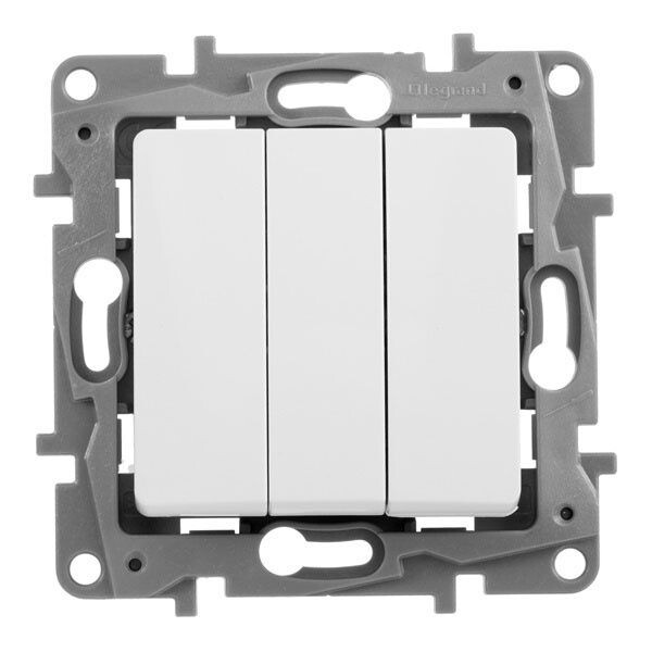 Выключатель трёхклавишный ETIKA для скрытого монтажа, номинальный ток 10 А. Предназначен для независимого управления тремя нагрузками с одного места. Подходит для управления многорожковыми люстрами и осветительными приборами с большим количеством ламп.