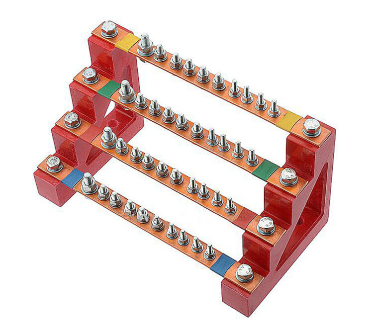 Блок медных шин 4х(20 мм)x10 (М5 - 4 шт.; М6 - 5 шт.; М8 - 1 шт.) присоединений, ширина - 250 мм, 275А (CBG-БФШ4-3.20-10). Предназначен для установки в низковольтных комплектных устройствах (НКУ). Служит для распределения переменного трёхфазного тока. Материал шины: медь.