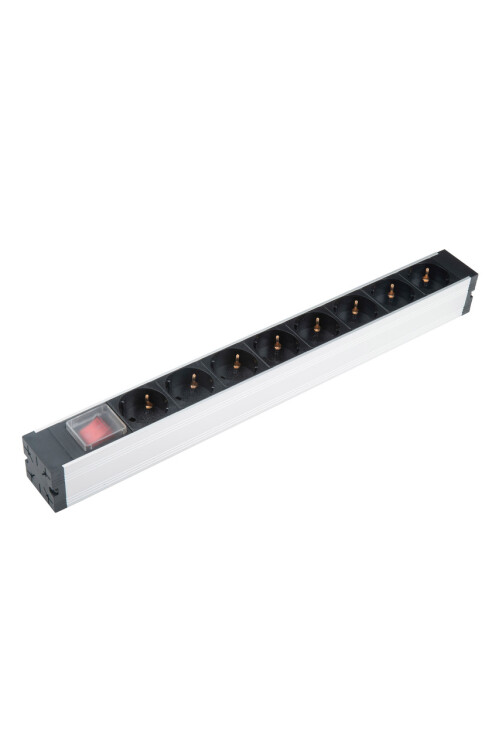 Hyperline SHZ19-8SH-S-IEC Блок розеток для 19" шкафов, горизонтальный, 8 розеток Schuko, выключатель с подсветкой, без кабеля питания, входной разъем IEC320 C14 10А, 250В, 482.6x44.4x44.4мм (ШхГхВ), корпус алюминий