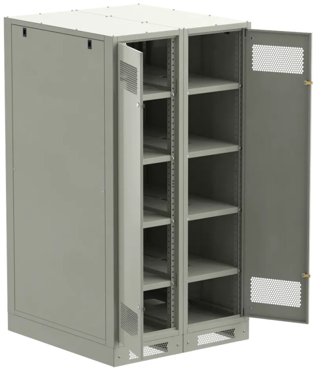 Шкаф аккумуляторный серии LINEA B предназначен для размещения и защиты от несанкционированного доступа аккумуляторных батарей (АБ). Шкафы LINEA B повышенной прочности со сварным каркасом и усиленными полками позволяют размещать АБ до 500 кг. на полке. В нижней части корпуса предусмотрена плата для установки предохранителя-выключателя-разъединителя ПВР. Шкаф аккумуляторный серии LINEA B двухсекционный поставляется на цоколе высотой 100мм. и состоит их двух секций. В месте эксплуатации требуется соединение секций метизами из комплекта поставки. Все металлические части шкафа LINEA B заземлены. В комплект включены РЫМ-болты для удобства перемещения шкафа. Вентиляционные отверстия в дверях и задней панели обеспечивают циркуляцию воздуха.