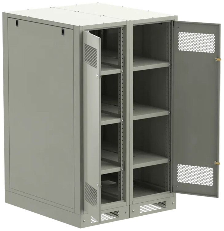 Шкаф аккумуляторный серии LINEA B предназначен для размещения и защиты от несанкционированного доступа аккумуляторных батарей (АБ). Шкафы LINEA B повышенной прочности со сварным каркасом и усиленными полками позволяют размещать АБ до 500 кг. на полке. Вместе со шкафом поставляются полки. Количество полок в комплекте зависит от высоты шкафа. Каркас позволяет размещать полки с шагом 30мм. В полках предусмотрены вырезы для удобства соединения АБ. В нижней части корпуса предусмотрена плата для установки предохранителя-выключателя-разъединителя ПВР. Шкаф аккумуляторный серии LINEA B двухсекционный поставляется на цоколе высотой 100мм. и состоит их двух секций. В месте эксплуатации требуется соединение секций метизами из комплекта поставки. Все металлические части шкафа LINEA B заземлены. В комплект включены РЫМ-болты для удобства перемещения шкафа. Вентиляционные отверстия в дверях и задней панели обеспечивают циркуляцию воздуха.