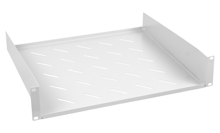 Консольная полка 2U переднего крепления на направляющие шкафов и стоек 19”. Предназначена для размещения малогабаритного оборудования, не имеющего стандартного 19” крепления. Полка имеет перфорацию, позволяющую охлаждать технологическое оборудование. Максимально разрешенная нагрузка -20 кг. Покрытие – порошковая ударопрочная краска, светло-серая (RAL7035). Толщина стали составляет 1,3 мм. Установка консольной полки производится путем крепления на направляющие 19” с помощью стандартного крепежа – квадратных гаек, винтов М6 и пластиковых шайб.