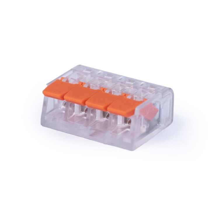 Универсальная соединительная изолированная клемма предназначена для многоразового подключения любых типов медных проводников: одножильных и многожильных. Зажим проводов в клемме осуществляется при помощи рычагов. Специальное технологическое отверстие на корпусе клеммы предназначено для проверки соединения тестером-пробником или щупом мультиметра. Клеммы обеспечивают простой и быстрый монтаж. Основные характеристики: Количество зажимов - 4, Проводник - одножильный/многожильный, Материал проводника - медь, Сечение проводника - до 4,0 мм², Номинальный ток - 32 А, Максимальное напряжение - 400 В, Материал контактов - луженая медь, Материал корпуса - поликарбонат, Температура эксплуатации:-30°C...85°C, Количество в упаковке - 10 шт.