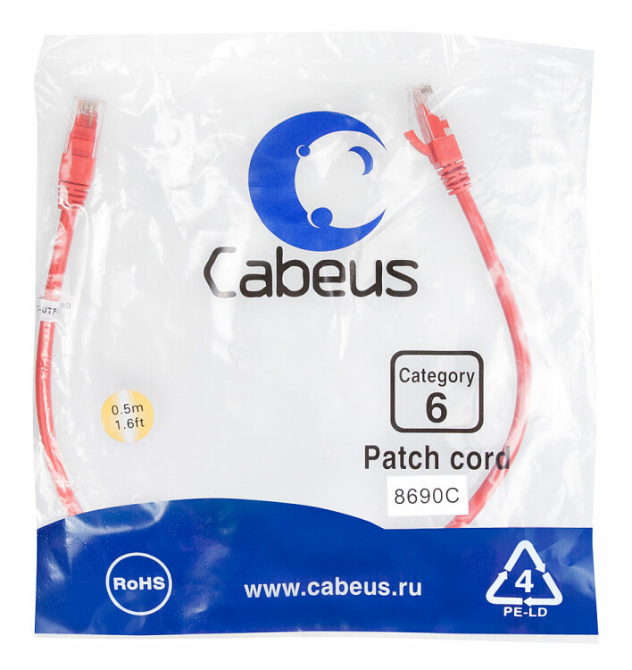 Патч-корд 4 пары, 2хRJ45, 0,5м, Кат.6, UTP, красный, PVC, Cabeus PC-UTP-RJ45-Cat.6-0.5m-RD