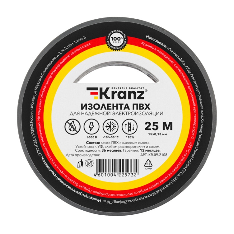 Изолента KRANZ предназначена для электрической изоляции, цветной маркировки, соединения, защиты от внешних факторов и герметизации кабелей, проводов и шнуров. Обеспечивает высокое качество обмотки и защищает места соединения от влаги, пыли, грязи, механических повреждений и перепадов температуры окружающей среды. Выполнена из высококачественной ПВХ-пленки с клеевым слоем. Не поддерживает горение Устойчива к УФ, слабым растворителям и солям