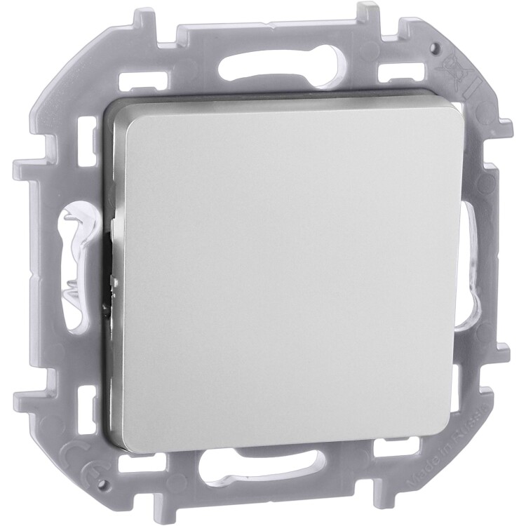 Переключатель одноклавишный скрытого монтажа Inspiria, цвет "Алюминий", номинальный ток 10АХ, напряжение ~250В, безвинтовые зажимы. Устанавливается в жилых и общественных помещениях для управления приборами освещения, вентиляции и т.д. Предназначен для управления одной нагрузкой с одного, двух или более мест (совместно с перекрёстными переключателями).