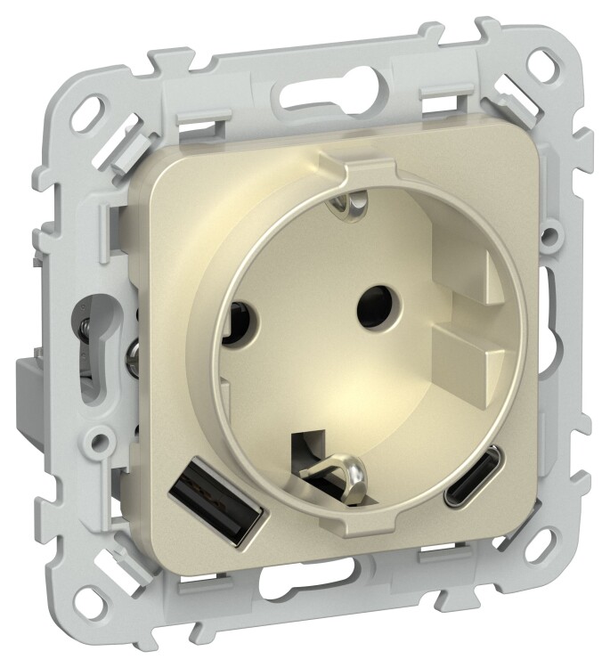 FLITE Розетка 1-местная с заземлением с защитными шторками 16А с USB A+C 20Вт РСЮшс11-0-ФлШ шампань