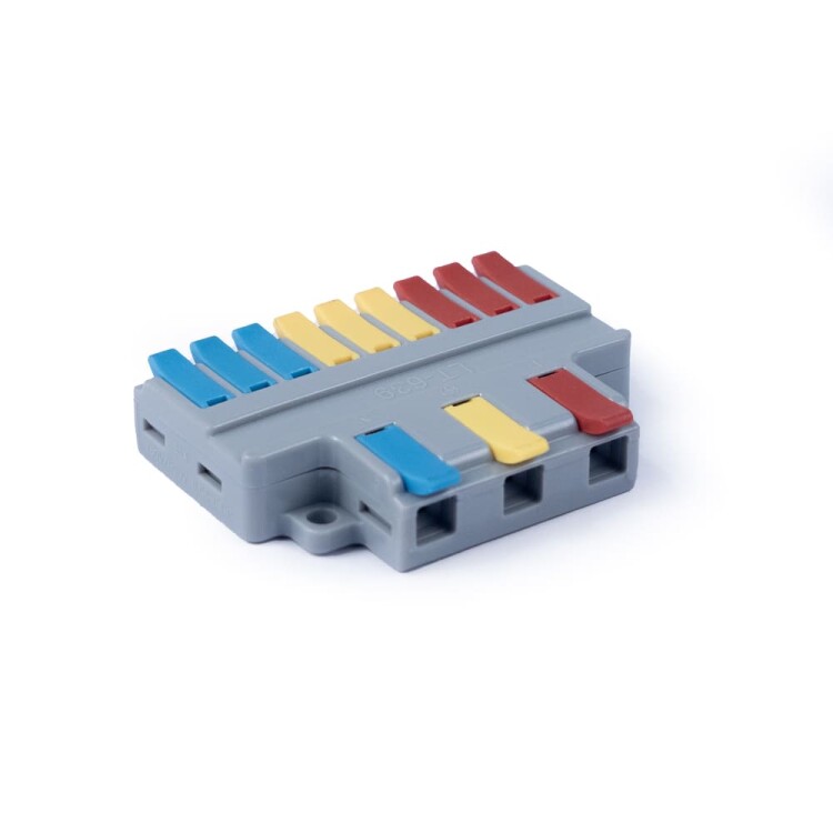 Универсальная проходная изолированная клемма предназначена для многоразового подключения любых типов медных проводников: одножильных и многожильных. Зажим проводов в клемме осуществляется при помощи рычагов. На корпусе есть боковые выступы для возможности крепления к любым поверхностям. Клеммы обеспечивают простой и быстрый монтаж. Основные характеристики: Количество зажимов - 12, Количество линий (полюсов) - 3, Проводник - одножильный/многожильный, Материал проводника - медь, Сечение проводника - до 6,0 мм², Номинальный ток - 35 А, Максимальное напряжение - 600 В, Материал контактов - луженая медь, Материал корпуса - полиамид, Температура эксплуатации -30°C...85°C.