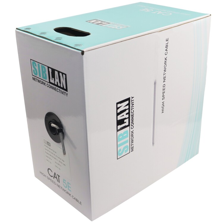 Четырехпарный кабель категории 5е предназначен для использования в локальных системах передачи данных со скоростью до 1 Гбит/с. Кабель производства SIBLAN выполнен в неэкранированном исполнении UTP и используется для прокладки внутри помещений. Диаметр жилы составляет 0.465 мм. Оболочка кабеля изготовлена из PVC (поливинилхлорида). Преимущество данного материала заключается в плотности и прочности, водостойкостью, воздухонепроницаемостью, термостойкостью. На внешней оболочке нанесены метки длины. Витая пара поставляется в картонной коробке типа «easy-pull box».