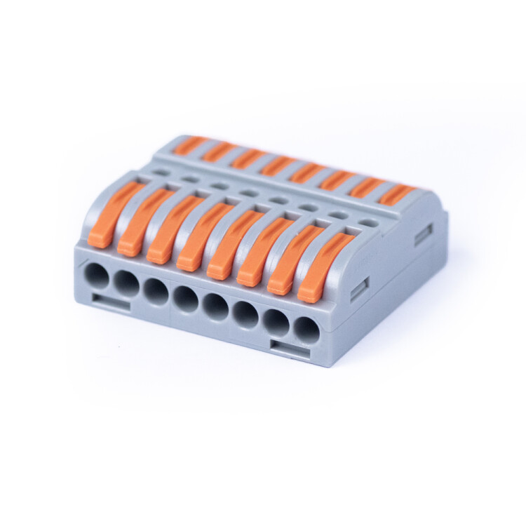 Универсальная проходная изолированная клемма предназначена для многоразового подключения любых типов медных проводников: одножильных и многожильных. Зажим проводов в клемме осуществляется при помощи рычагов. Специальное технологическое отверстие на корпусе клеммы предназначено для проверки соединения тестером-пробником или щупом мультиметра. Клеммы обеспечивают простой и быстрый монтаж. Основные характеристики: Количество зажимов - 16, Количество линий (полюсов) - 8, Проводник - одножильный/многожильный, Материал проводника - медь, Сечение проводника - до 4,0 мм², Номинальный ток - 32 А, Максимальное напряжение - 400 В, Материал контактов - луженая медь, Материал корпуса - полиамид, Температура эксплуатации -30°C...85°C.