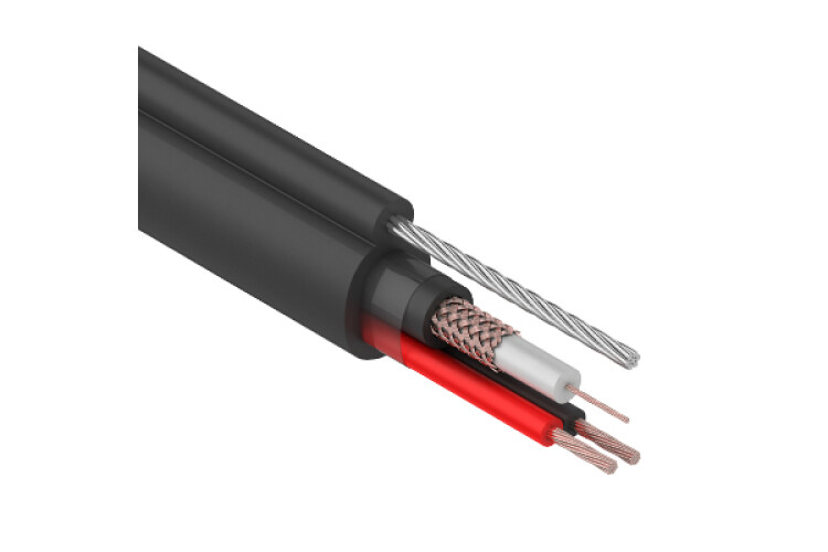 Кабель KBK-П-2+2х0,75 мм² + ТРОС (7х0,4 мм) REXANT предназначен для передачи телевизионных сигналов в системах видеонаблюдения с одновременным подключением питания и/или передачи сигналов управления. Дополнительный элемент в кабеле «ТРОС-стальной» делает конструкцию более жёсткой, что позволяет производить монтаж и эксплуатацию кабеля без провисания. Кабель состоит из радиочастотного (коаксиального) кабеля и жил питания, объединенных под единой оболочкой. Коаксиальный кабель состоит из медного монолитного проводника, диэлектрика из полиэтилена, внешнего проводника из медных жил в виде оплётки и оболочки из светостабилизированного полиэтилена PE, аналог кабеля (РК-75-2-11). Жила питания (медная) многожильная, сечением 0,75 мм² в изоляции из ПВХ. Дополнительный многожильный стальной ТРОС состоящий из семи жил диаметром 0,40 мм. Рабочее напряжение токопроводящей жилы до 600В. Общая оболочка из PE (полиэтилена). Диаметр кабеля 8 мм.