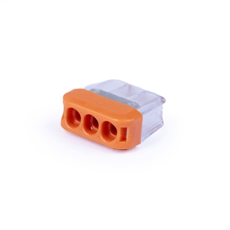 Соединительная изолированная клемма предназначена для соединения одножильных медных проводников. Фиксация проводников в клемме осуществляется при помощи плоско-пружинного зажима. Специальное технологическое отверстие на корпусе клеммы предназначено для проверки соединения тестером-пробником или щупом мультиметра. Клеммы обеспечивают простой и быстрый монтаж. Основные характеристики: Количество зажимов - 3, Наличие контактной пасты - нет, Проводник - одножильный, Материал проводника - медь, Сечение проводника - до 2,5 мм², Номинальный ток - 24 А, Максимальное напряжение - 450 В, Материал контактов - луженая медь, Материал корпуса - полиамид, Температура эксплуатации: -30°C...85°C.