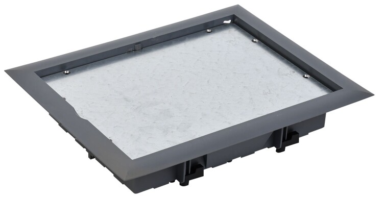 Лючок напольный ONFLOOR закрытый (глухая крышка). Предназначен для установки в напольную коробку ONFLOOR 24 и применяется в качестве глухой крышки для организации пересечений или ответвлений кабельных линий (не предназначен для установки ЭУИ). Отверстие, необходимое для установки в фальшпол – 218x288 мм. Крышка лючка имеет небольшое углубление, усиленное стальным листом, для монтажа напольного покрытия с максимальной толщиной 8 мм (рекомендуемые напольные покрытия - ковер или ламинат). Степень защиты IP30 - коробка не предназначена для влажной уборки. Конструкция лючков рассчитана на максимальную нагрузку 1500Н. Комплект поставки: Лючок напольный ONFLOOR закрытый - 1 шт., трафарет для финишного покрытия - 1 шт., комплект крепежа - 1 компл. Коробки для установки лючка в бетонный пол приобретаются отдельно. Цвет: темно-серый RAL 7012.