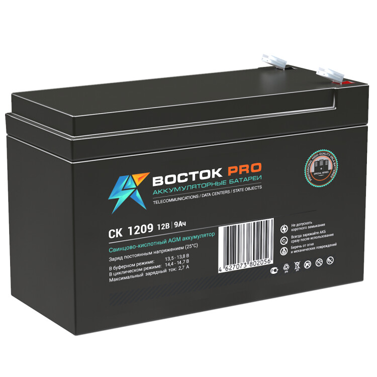 Свинцово-кислотные аккумуляторы ВОСТОК серии CK предназначены для использования в системах бесперебойного питания, резервного энергоснабжения, автономных энергосистемах. Изготовлены по AGM технологии (электролит, абсорбированный в стекловолоконном сепараторе), являются герметизированными и необслуживаемыми, со сроком службы в буферном режиме 10 лет (от 5 до 26 Ач – 5 лет). Обладают высокими разрядными и эксплуатационными характеристиками благодаря использованию в составе электролита и намазной пасты специальных добавок, препятствующих коррозии и замедляющих процесс старения.