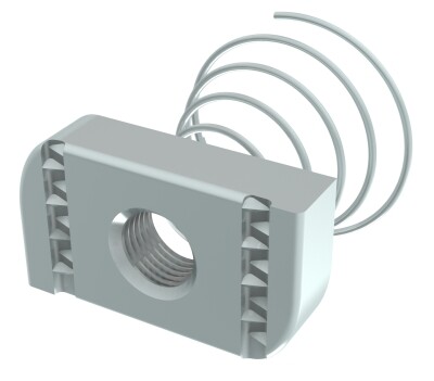 STRUT-гайки с конусной пружиной (канальные гайки) предназначены для сборки опорных конструкций на основе STRUT-системы (профили, консоли, подвесы, стойки), а также для крепления к ним металлических кабельных лотков, магистральных систем коммуникаций и оборудования. Конусная пружина фиксирует гайку в профиле во время монтажа.