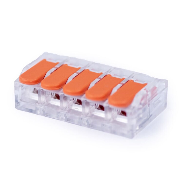 Универсальная соединительная изолированная клемма предназначена для многоразового подключения любых типов медных проводников: одножильных и многожильных. Зажим проводов в клемме осуществляется при помощи рычагов. Клеммы обеспечивают простой и быстрый монтаж. Основные характеристики: Количество зажимов - 5, Проводник - одножильный/многожильный, Материал проводника - медь, Сечение проводника - до 6,0 мм², Номинальный ток - 41 А, Максимальное напряжение - 450 В, Материал контактов - луженая медь, Материал корпуса - поликарбонат, Температура эксплуатации: -30°C...85°C.