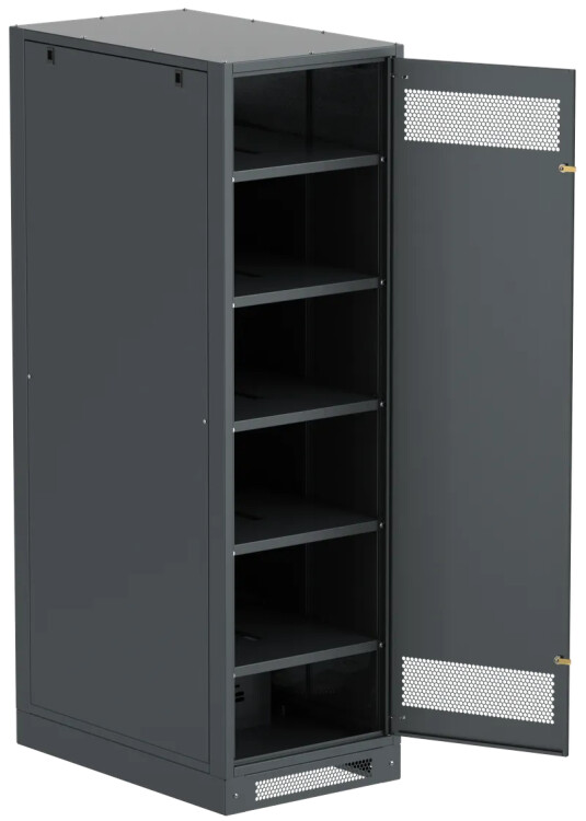 Шкаф аккумуляторный серии LINEA B предназначен для размещения и защиты от несанкционированного доступа аккумуляторных батарей (АБ). Шкафы LINEA B повышенной прочности со сварным каркасом и усиленными полками позволяют размещать АБ до 500 кг. на полке. Вместе со шкафом поставляются полки. Количество полок в комплекте зависит от высоты шкафа. Каркас позволяет размещать полки с шагом 30мм. В полках предусмотрены вырезы для удобства соединения АБ. В нижней части корпуса предусмотрена плата для установки предохранителя-выключателя-разъединителя ПВР. Шкаф аккумуляторный серии LINEA B односекционный поставляется на цоколе высотой 100мм. Все металлические части шкафа LINEA B заземлены. В комплект включены РЫМ-болты для удобства перемещения шкафа. Вентиляционные отверстия в дверях и задней панели обеспечивают циркуляцию воздуха.